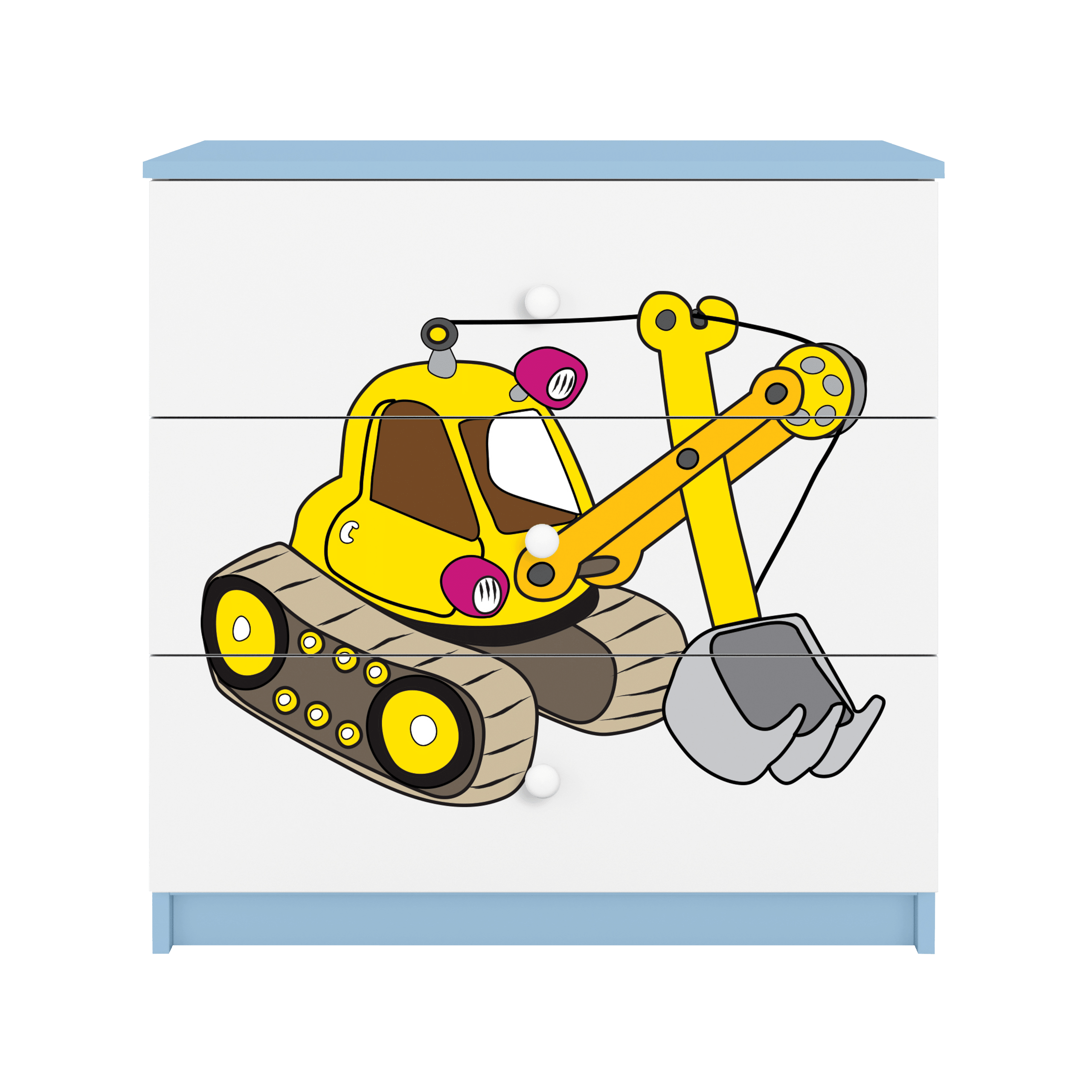 Denne sjove Babydreams børnekommode kan sætte fantasien igang hos de fleste børn. Den er nemlig dekoreret med et gravemaskineklistermærke i multifarver.Kommoden er lavet i hvid og blå lamineret spånplade og designet med tre skuffer til opbevaring af både