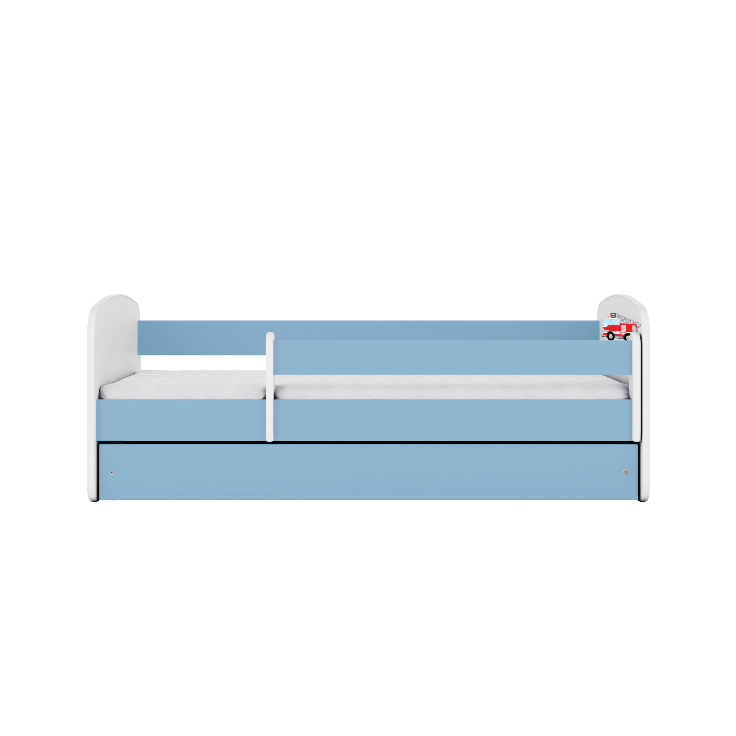 Babydreams juniorseng med brandbil, m. madras, sengehest, skuffe – hvid og blå laminat (160×80)