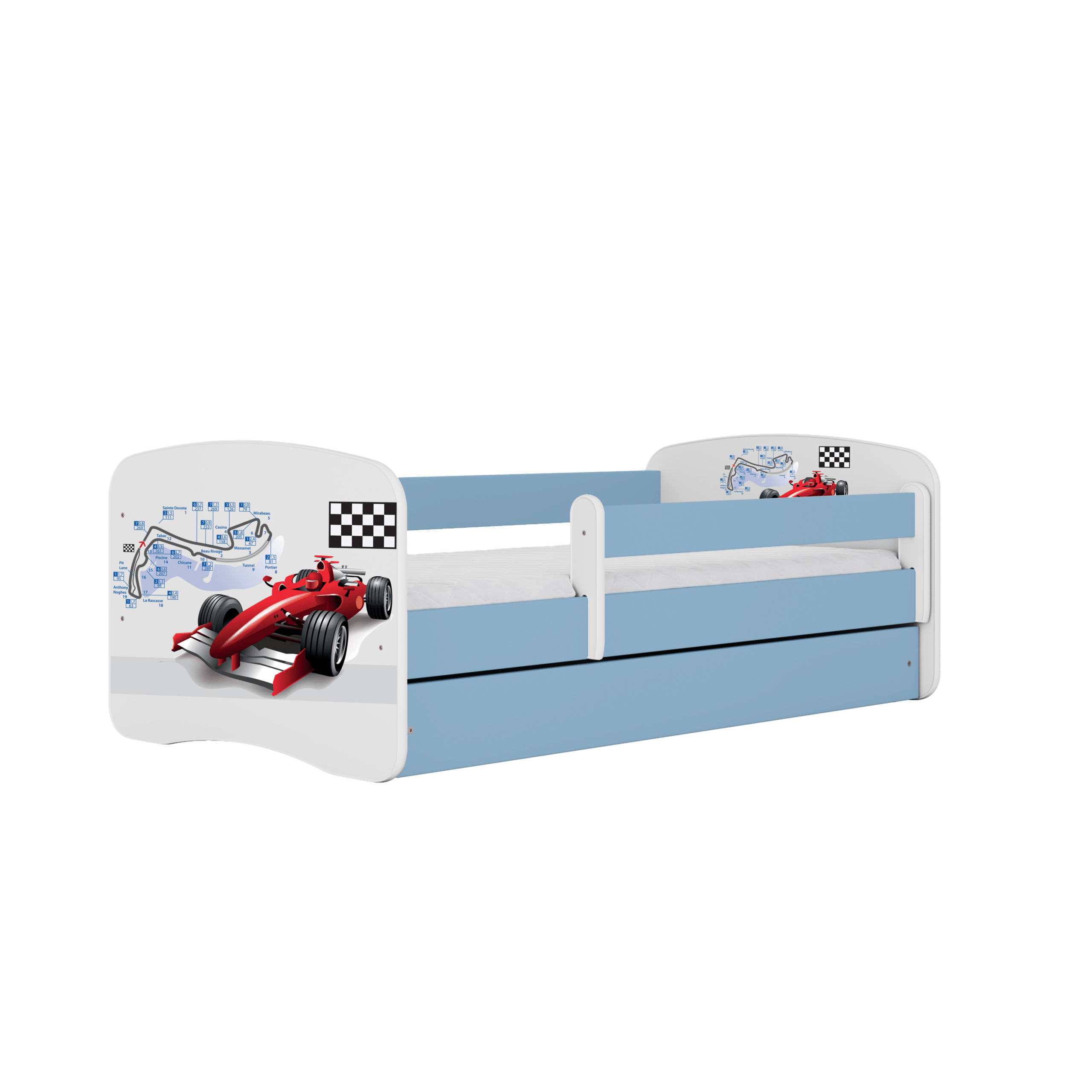 Babydreams juniorseng med racerbil, m. madras, sengehest, skuffe – hvid og blå laminat (180×80)