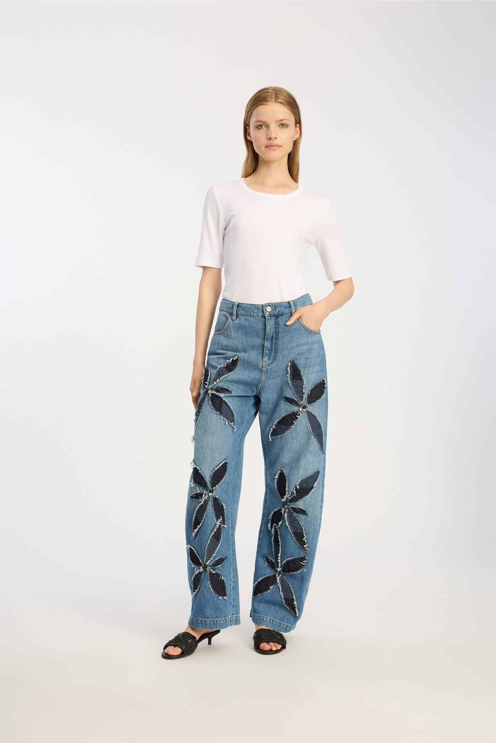 Disse jeans er fremstillet i klassisk blå denim med en barrel pasform. Modellen har høj talje, lynlås- og knaplukning samt femlommedesign. Jeansene er dekoreret med påsyede blomsterapplikationer i mørkere denim, der giver et markant og grafisk udtryk. App