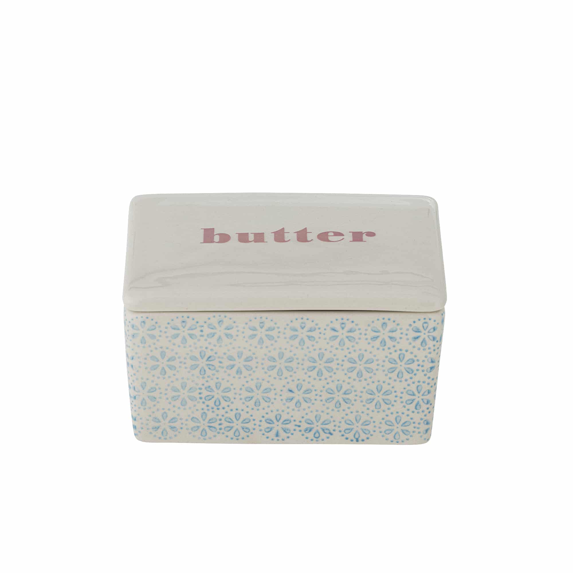 Patrizia Smørboksen fra Bloomingville er lavet af stentøj i bløde, harmoniske nuancer. Den har et blankt beige låg og en afdæmpet blå bund, og er pyntet med ordet “butter” i diskret lyserød samt fine blomsterdetaljer. En charmerende og praktisk