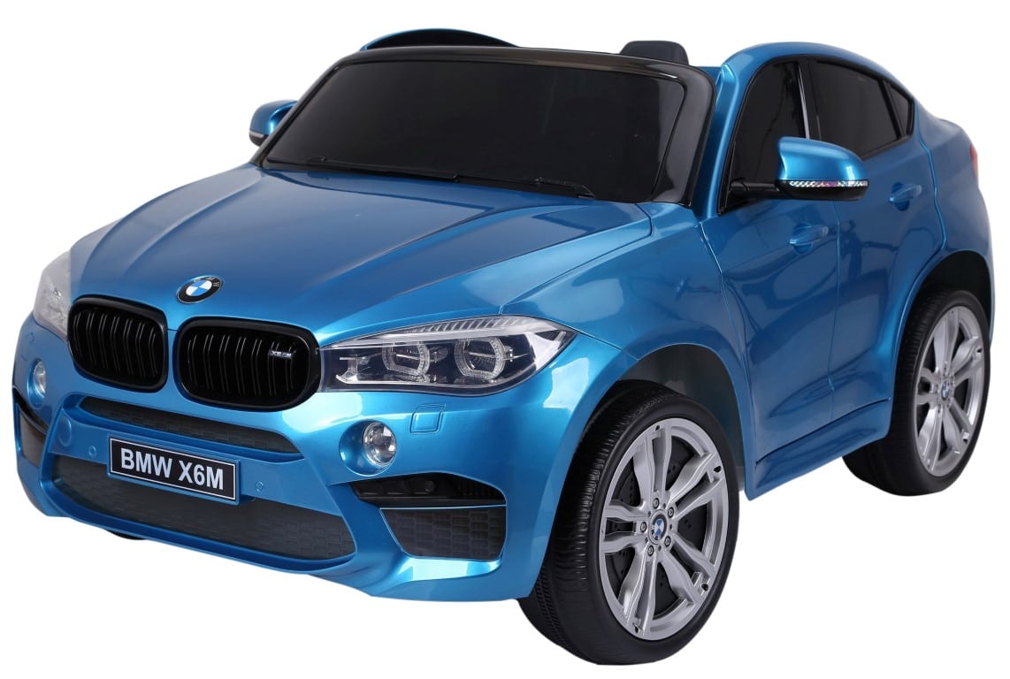 Speciel udgave med blå lakering! Meget stor BMW X6 M elbil til 2 børn. De kraftige motorer giver træk på begge baghul, og gør den yderst terrængående, så den nemt kan køre i græs, jord m.v. Bilen leveres hos os med gummihjul som giver mindre støj og bedre