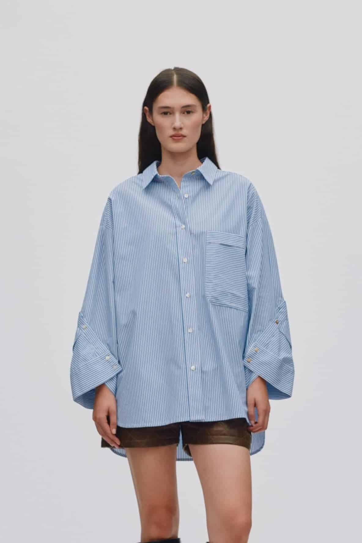 Denne oversized skjorte er fremstillet i et let og sprødt materiale, der føles behageligt mod huden. Designet kendetegnes af en meget rummelig pasform med lange ærmer med manchetter, klassisk krave og en stor brystlomme med kontraststriber.