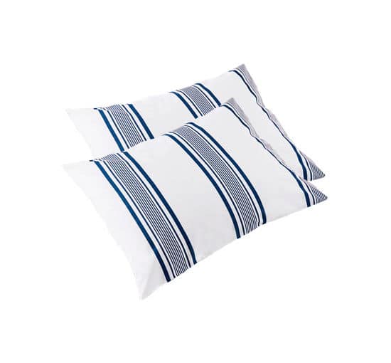 Cap Ferrat pudebetræk i 2-pak med striber i blå og hvid. Passer perfekt ind i et marineinteriør. Opkaldt efter den naturskønne franske halvø Cap Ferrat i Middelhavet. Vores pudebetræk er lavet af 100% OEKO-TEX-certificeret bomuld.
