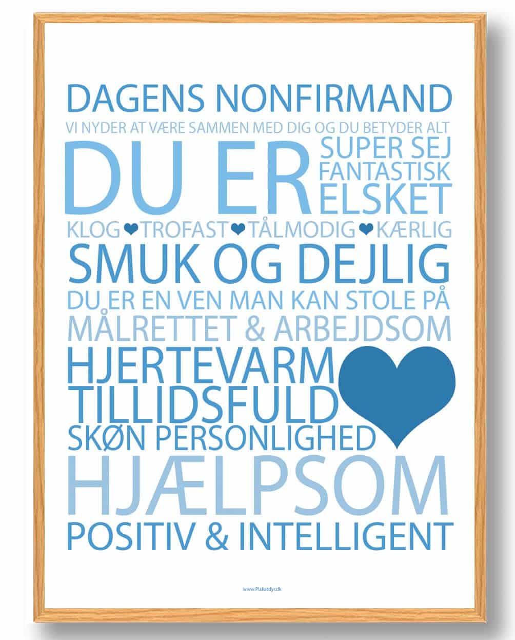 Dagens Nonfirmand blå plakat Fejr en helt særlig dag med Dagens Nonfirmand blå plakat fra Plakatdyr.dk. Denne poster er skabt til at gøre nonfirmationen mindeværdig for den unge. Farven blå giver et friskt og festligt udtryk, som passer godt til både d