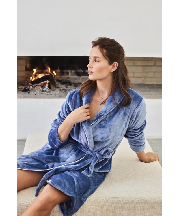 DECOY lang morgenkåbe i velour til kvinder i blå er både elegant og komfortabel. Den bløde velour og stilfulde piping giver en luksuriøs følelse, perfekt til hyggelige morgener eller afslappende aftener derhjemme.