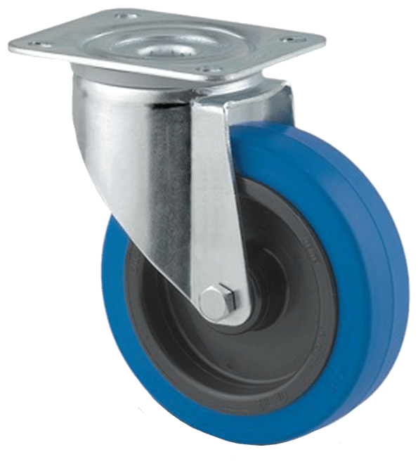 Drejeligt dobbelthjul med gaffel i svær stålplade med bred gaffelform og dobbelt kuglekrans. Nav i polyamide med blå elastisk gummibane og rulleleje. Med plade. Fås i flere dimensioner. Drejeligt hjul