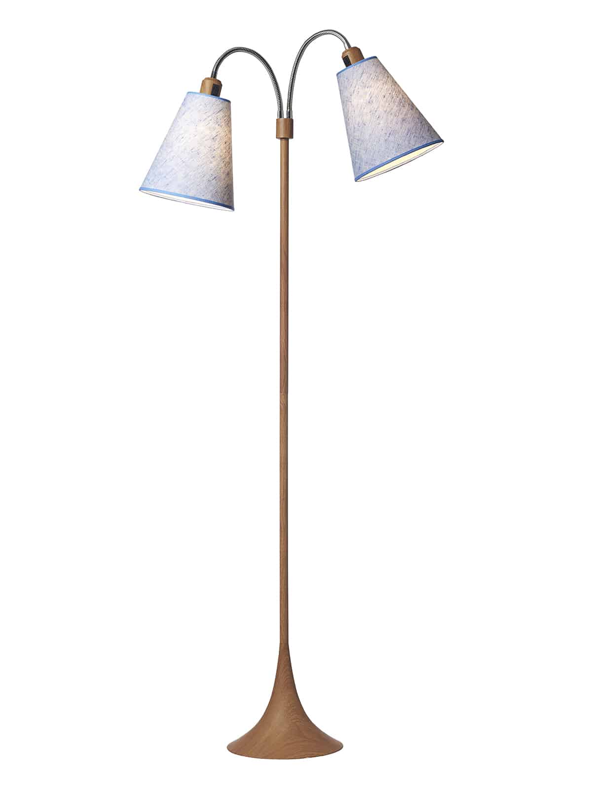 Der medfølger 210 cm. sort ledning til lampen.Lampen bruger 2 x standard pære med stor fatning (E27) som skal tilkøbes.Lampen har afbryder på hvert lampehoved.Fodgænger Gulvlampe trælook m/blå nistret skræmeOpgrader din indretning med denne smukke Fodgæng
