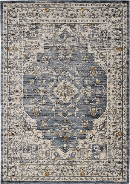 Gulvtæppe Loomery Troye – blå med medallion-design og gyldne accenter i slidstærk polyester 200Ã290 cm
