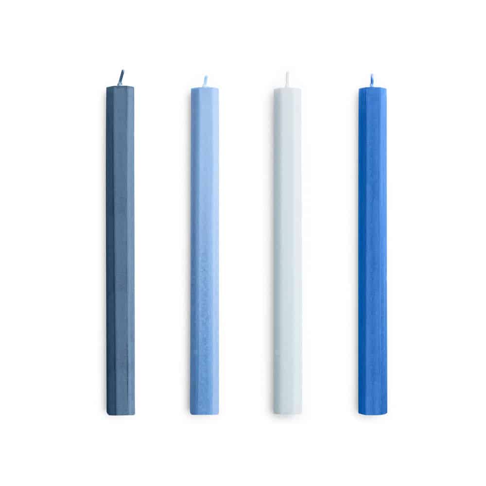 Sæt af fire stearinlys fra HAY i blå nuancer. Sættet indeholder fire sekskantede kronelys.