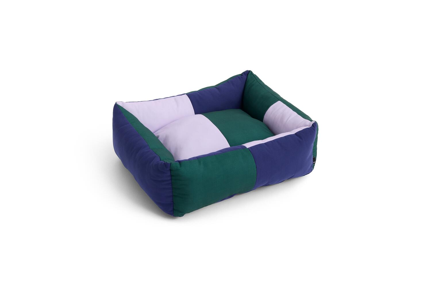 >Hundesengen er designet med grønne, lavendel og blå tern og kommer i et blødt pudedesign.