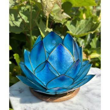 Denne lotus står på en smuk træbund og kanterne på de smukke blå blade er i guld farve. Det smarte ved denne lysestage er at du kan tage det øverste af hvilket gør det nemt at tænde fyrfadslyset. Lotus symboliserer mørke til lys, uvidenhed til viden. Om C