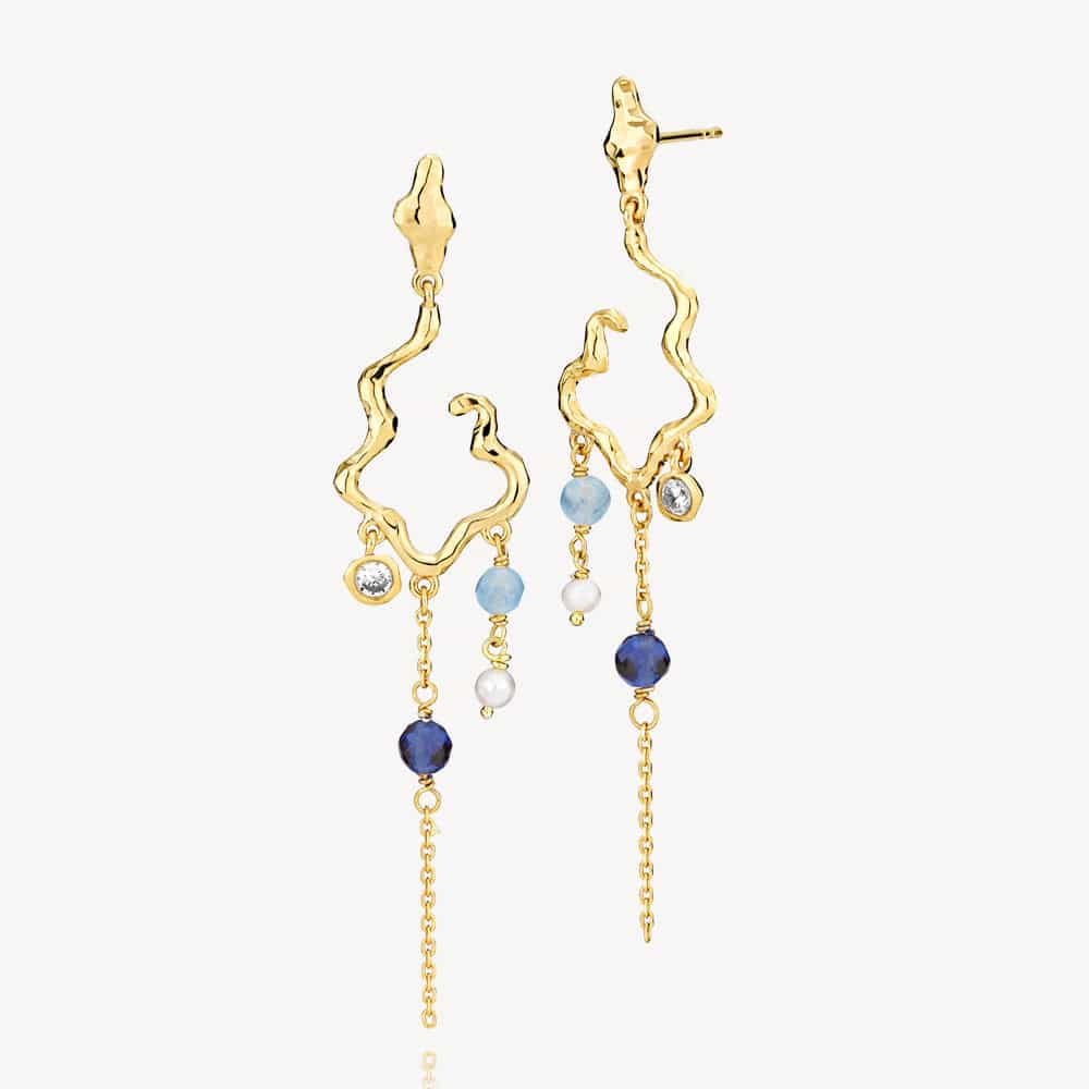 Lange smukke øreringe fra Louisa kollektionen Disse øreringe er fremstillet i 18kt guldbelagt genbrugssølv og designet med en banket og organsik overfalde. Fra øreringene hænger både kæder, zirkoner og perler af blå kvarts, blå krystaller og ferskvandsper