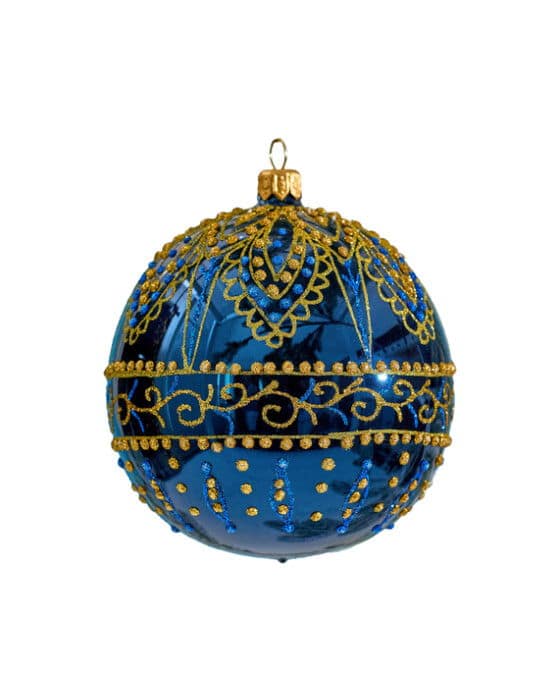Dekorativ blå julekugle med et smukt mønster i glitter med farverne guld og blå. Skab en fortryllende stemning i dit hjem og pynt dit juletræ med eksklusive julekugler fra Lux. Kollektionen Lux er en unik serie af håndlavede glaskugler i forskellige farver og former med smukke, detaljerede mønstre. En klassisk dekoration til dit hjem, der skaber en ægte julestemning.