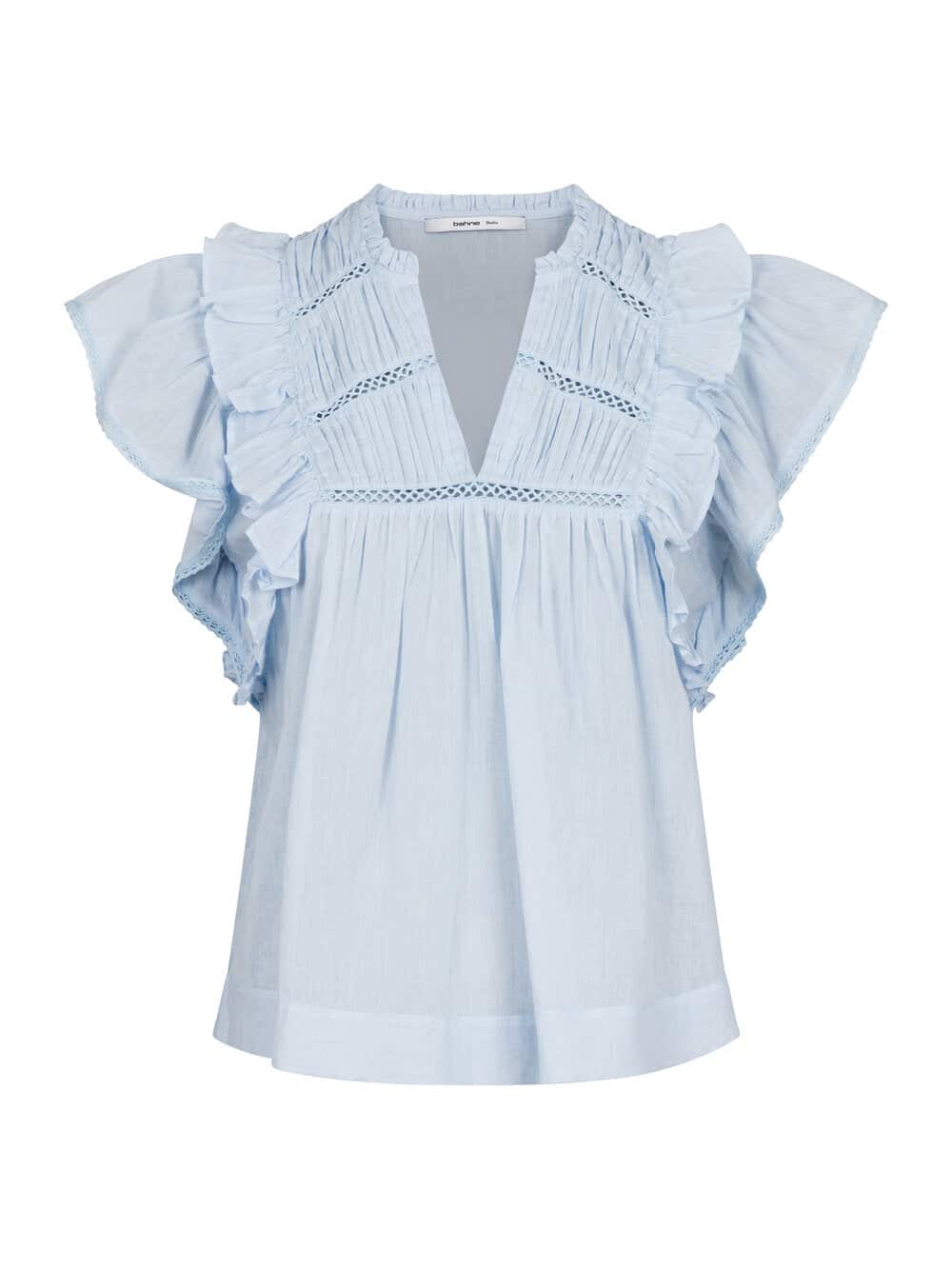 Mable Voile toppen er designet i en kort loose silhuet med korte ærmer, v-udskæring og flæser på ærmerne. Blusen er dekoreret med små broderinger, som giver blusen et romantisk udtryk.
