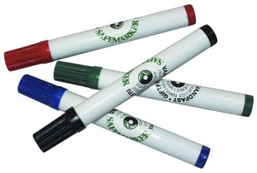 Safemarker mærkepen. Vandfast, giftfri, lysægte, hurtigt tørrende. Med hærdet let tilspidset spids. Æske med 10 stk. Farve blå.