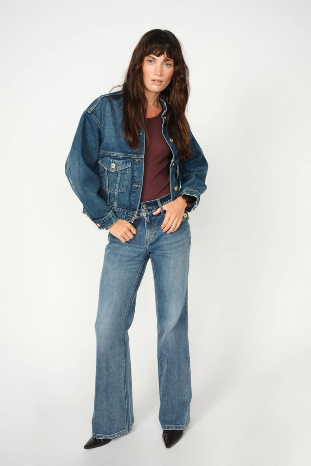 Marlena Nolla jeansene fra Mos Mosh er designet med flare-pasform og mellemhøj talje. Jeansene er fremstillet i en klassisk blå denimvask og har en unik detalje med en dobbelt knap- og lynlåslukning foran.