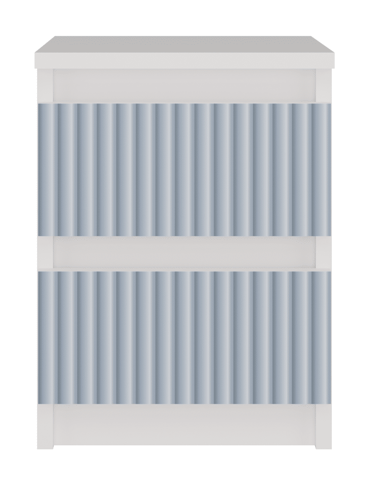 Moderne sengebord med 2 skuffer Serie: MALWA Model: M2 ARTESO Farve: Korpus: Hvid Front: Blå MALWA M2 ARTESO er et stilfuldt og funktionelt sengebord, der kombinerer moderne design med praktisk opbevaring. De blå fronter med lodrette, trykte mønstre skabt