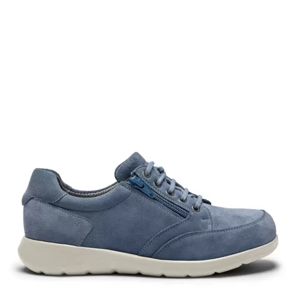 Damesko med snøre og lynlås fra mærket New Feet, som er lavet med en behagelige overdel i ruskind i farven blå, som ikke alene giver dem et flot udtryk, men også gør dem behagelige at have på. Skoens sål er lave ti EVA og har et Hælløft på 25 mm – drop 15 mmLæst: 78Læstegruppe: SIndersål: Protektor 6 mm (udtagelig)