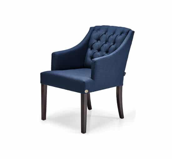 Delano er en tidløs og stilfuld stol med armlæn fra Newport Collection. Spisebordsstolen er omhyggeligt fremstillet af udvalgte materialer for at skabe den rette balance mellem kvalitet og design. Med sit knapbetrukne ryglæn og den bløde polstring af koldskum er Delano en meget behagelig og komfortabel stol, der udstråler raffineret luksus og elegance. Stolen er betrukket med blåt fint struktureret slidstærkt stof. Konstruktionen er af fyrretræ og stolebenene af kvalitetsbirketræ, der er lakeret i en mørkebrun bejdse. Newport-emblem i messing sidder på spisebordsstolens forreste ben. Med sin klassiske form og fornemme farve i indigo/blå passer Newport Delano spisebordsstolen til mange spiseborde. Delano stol med armlæn fås også i farverne sand og hvid.