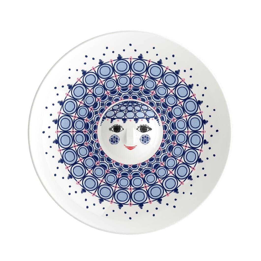 Olga fadet fra Bjørn Wiinblad i glaseret keramik er dekoreret i blå nuancer med lyserøde prikker og ikoniske Wiinblad-detaljer. Brug det som frugtfad, dekorativt centerpiece eller hæng det på væggen som et kunstnerisk blikfang.