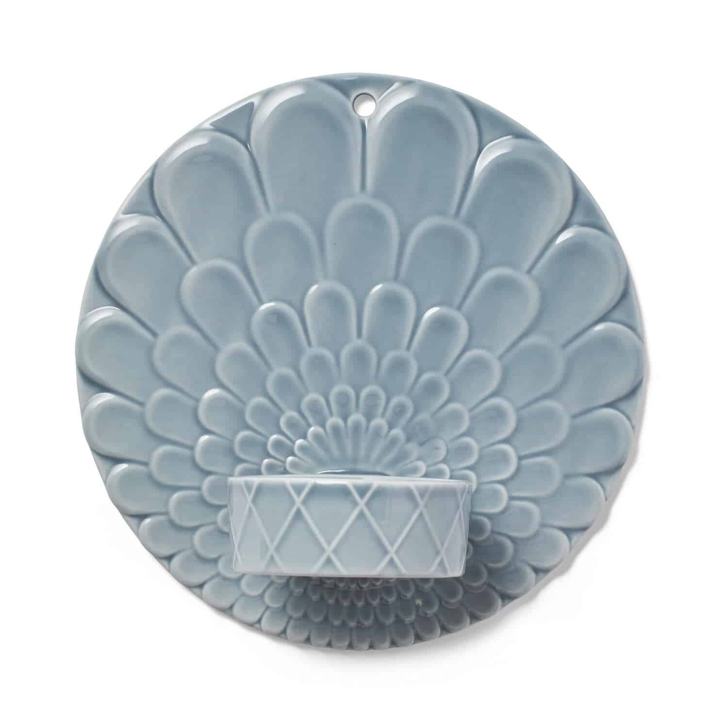 Denne væghængte fyrfadslysestage fra Dottir bruger et stort fyrfadslys. Lysestagen er designet med bløde, blomsterlignende former og foran er der en lille holder med diskret mønster. Lysestagen er udstyret med et hul øverst, så den nemt kan hænges op på