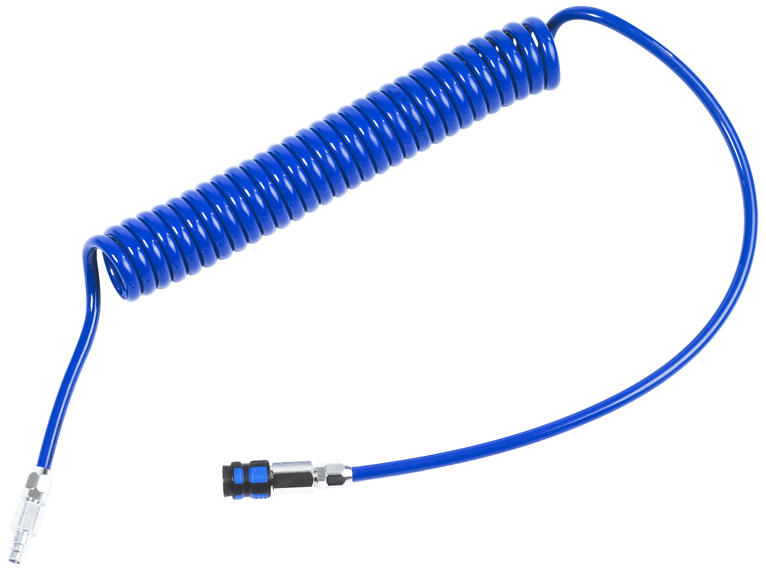 Blå, PUR-spiralslange monteret med Rectus serie 1625 kobling og nippel. Maks. arbejdstryk 10 bar. Frie ender hhv. 150/450 mm. Slange