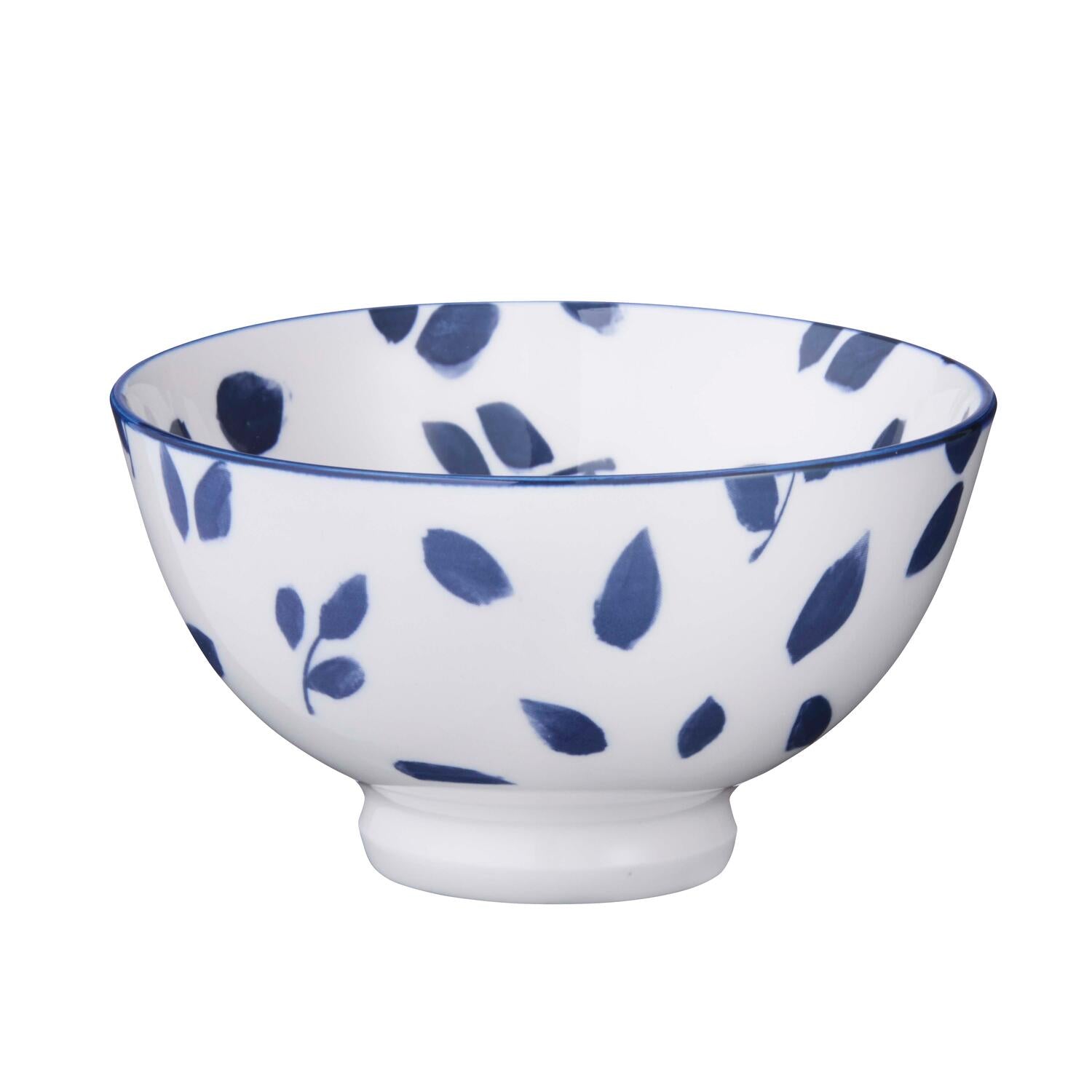 Risskål fra Bahne Interior dekoreret med blade og en blå kant. Skålen er fremstillet af porcelæn og har en diameter på 11,6 cm og en højde på 6,3 cm.