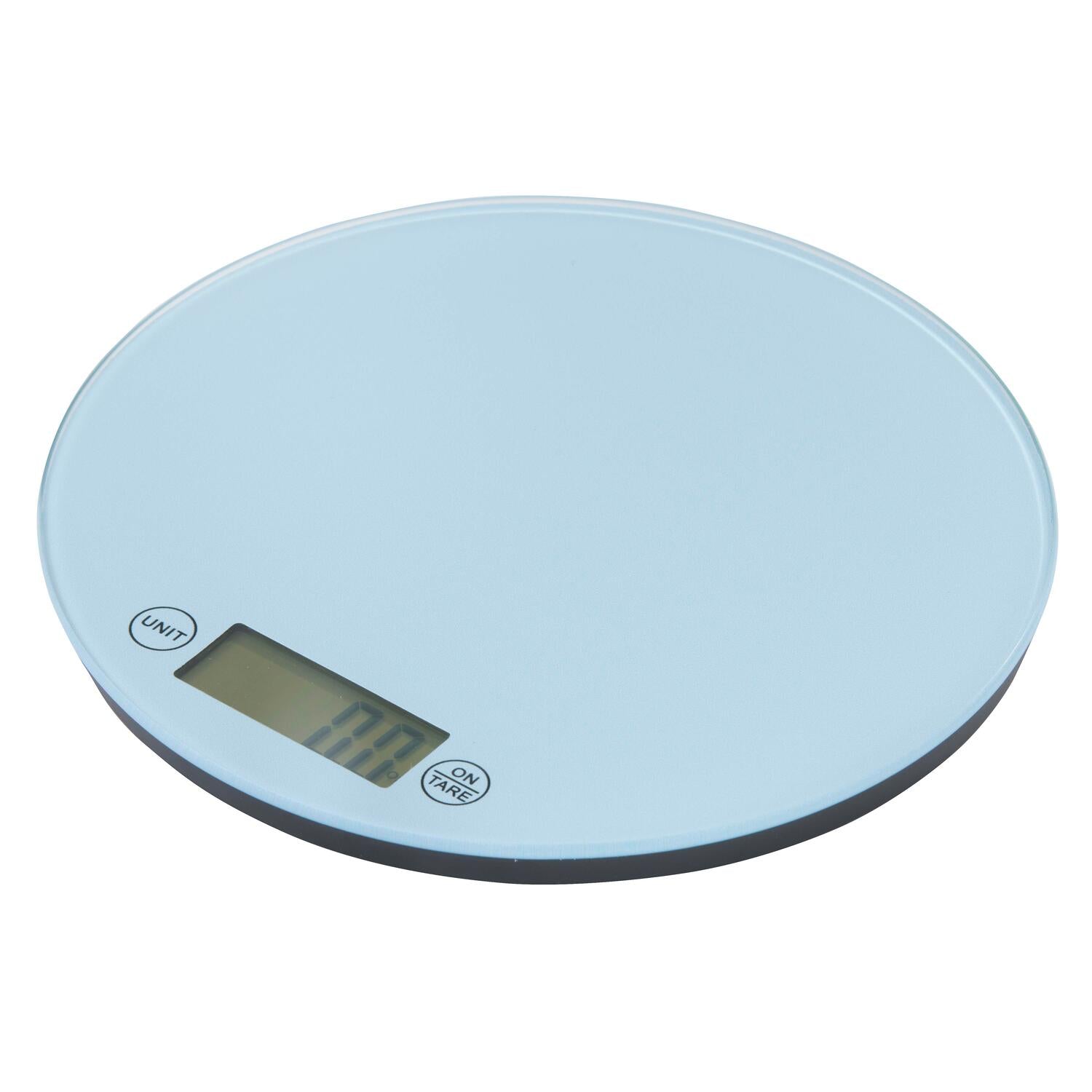 Denne runde køkkenvægt er simpelt designet i lyseblå Køkkenvægten fra Bahne Interior har en diameter på 18 cm og er fremstillet af glas.