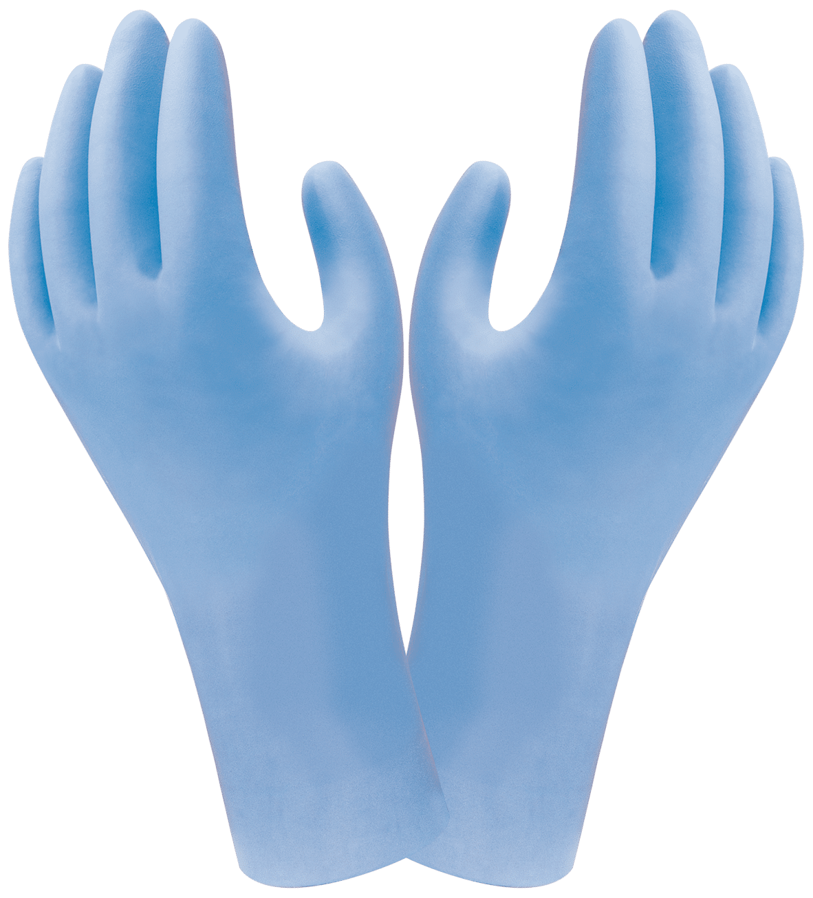 Blå nitril-engangshandske uden pudder (fremstillet af biologisk nedbrydeligt nitril). Modellen har lige kant og struktur på overfladen af fingrene. Længde 24 cm, tykkelse 0,1 mm. AQL 1. Fødevaregodkendt. EN 420:2003+A1:2009, EN ISO 374-1:2016/type B, EN I