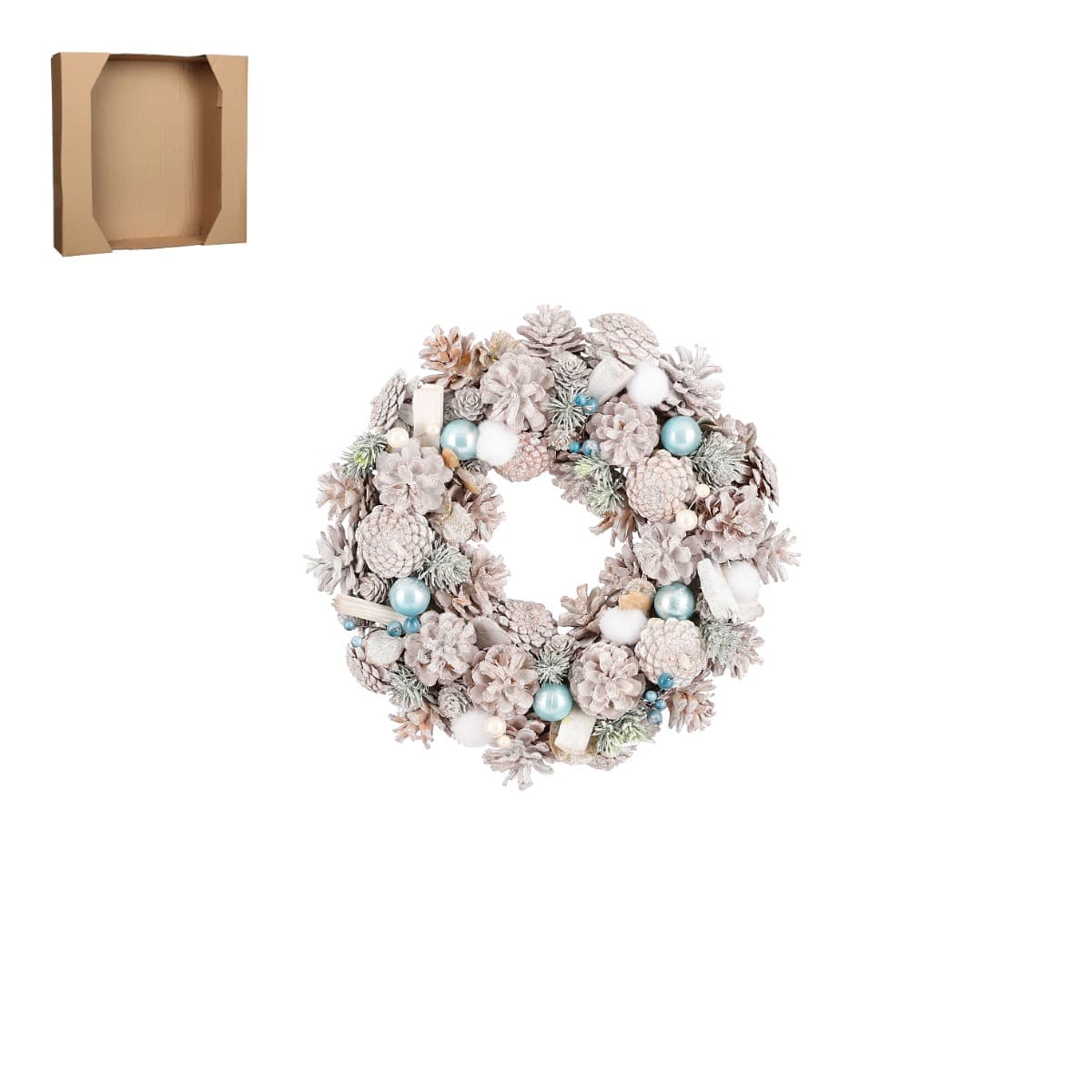 Krans masser af snehvide kogler, blå julekugler, kunstgran og perler. Kransen kan både hænges eller lægges på et bord. De blå nuancer lyser de hvide kogler flot op. Mål:Diameter: 34 cmHøjde: 9 cmFremstillet i natur- og kunstmaterialer.Pakket med 1 stk.