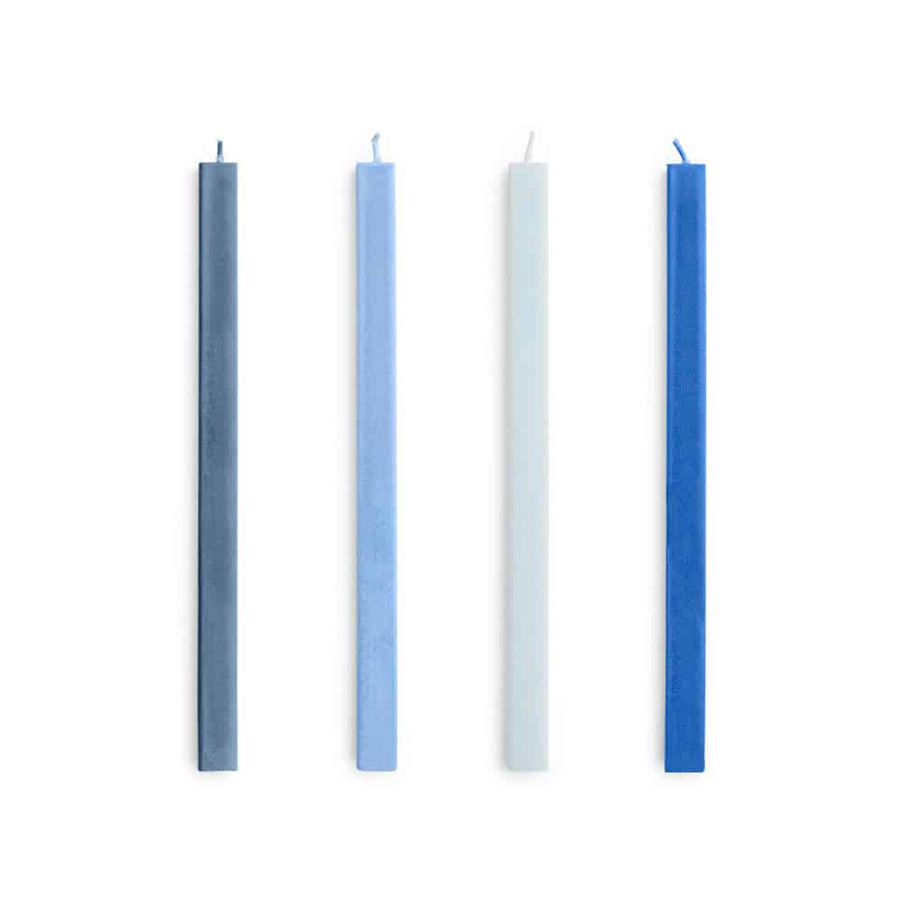 Dette sæt fra HAY indeholder fire firkantede stearinlys i forskellige blå nuancer.