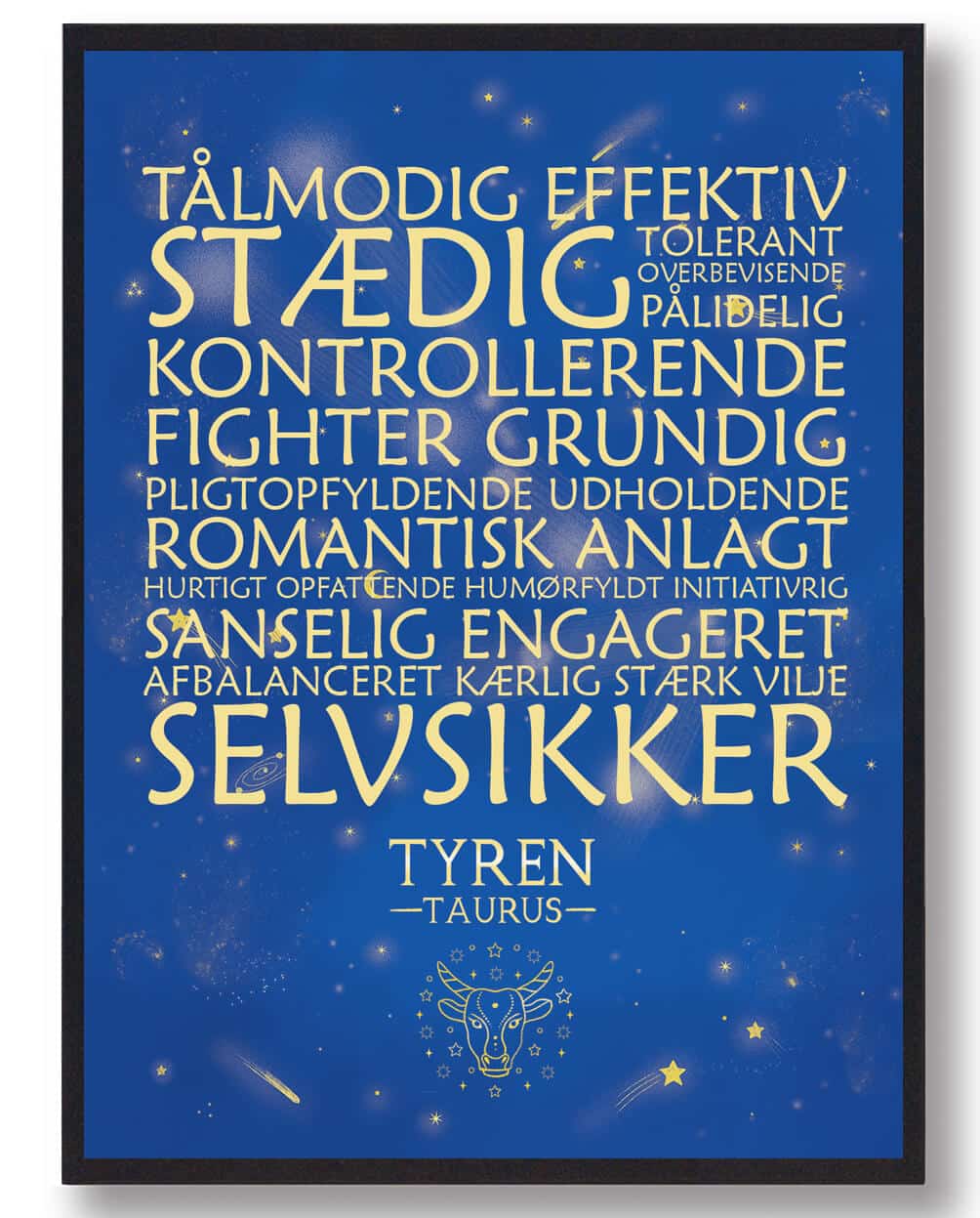 Stjernetegn Tyren blå plakat Giv væggen et hav af ro og nydelse med plakaten Stjernetegn Tyren blå plakat. Dette design hylder stjernetegnet Tyren (21. april 20. maj) i en kølig blå nuance et oplagt valg for den stabile, sanselige og jordbundne perso