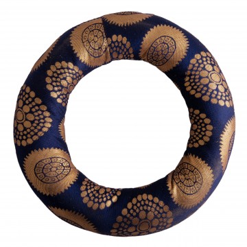 Stor blå pude/donut til syngeskål 26 cm Denne syngeskålspude har et traditionelt nepalesisk udsèende. Det magiske guldbroderi bringer et eksklusivt præg til rummet.Meget velegnet til ekstra store syngeskåle. Fyldt med kraftig bomuld.Mål: Udvendig diamete