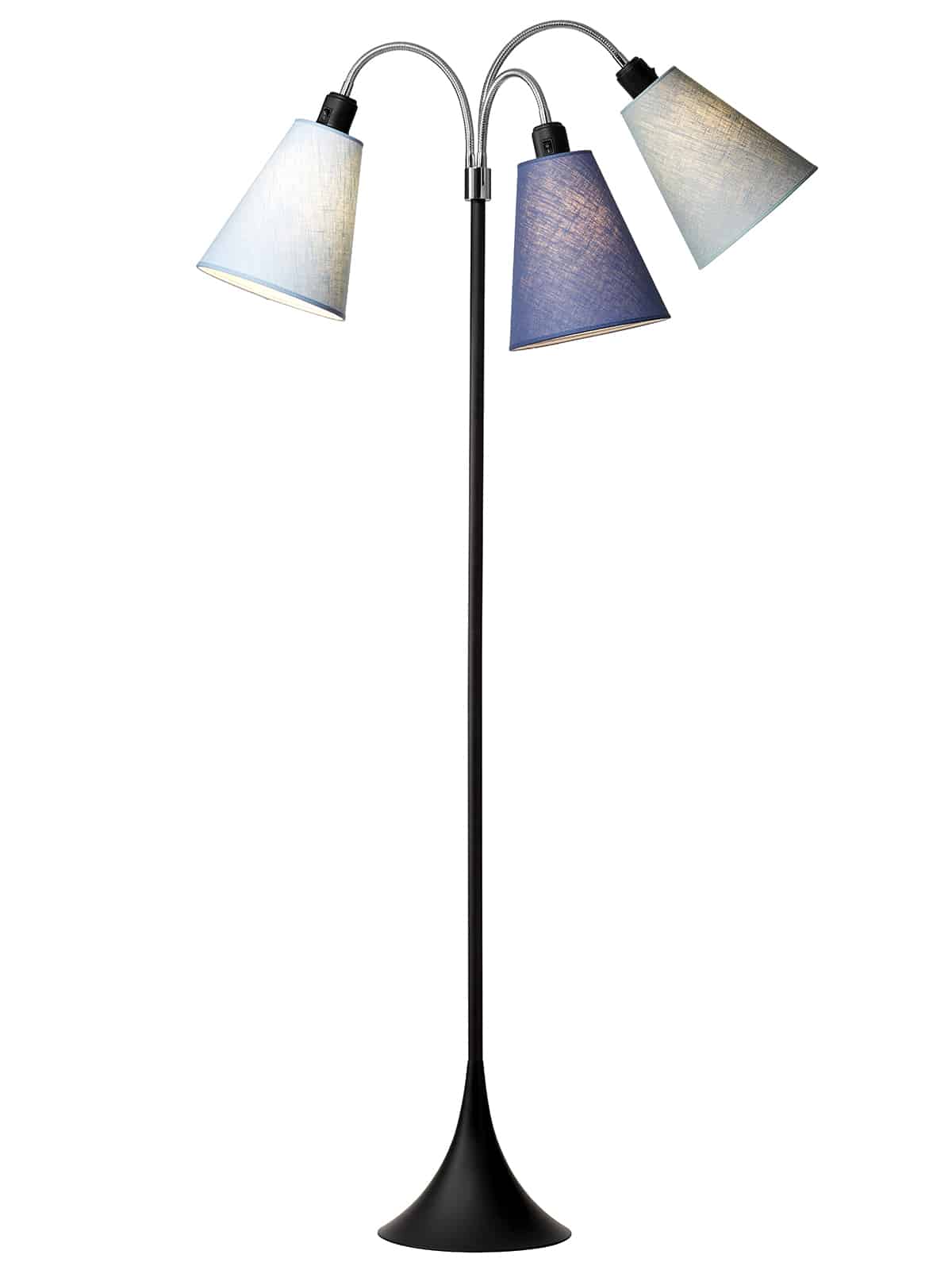 Der medfølger 210 cm. sort ledning til lampen.Lampen bruger 3 x standard pære med stor fatning (E27) som skal tilkøbes.Lampen har afbryder på hvert lampehoved.Trafik Gulvlampe sort m/lyseblå, dalablå og turkis blå skærmeDenne smukke gulvlampe fra Nielsen