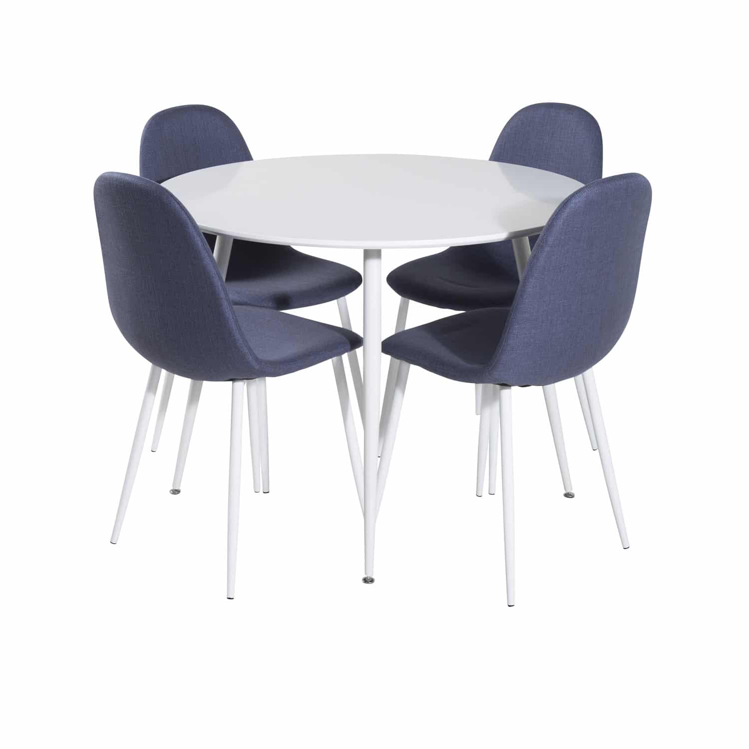 Stilfuldt Plaza spisebordssæt fra Venture Design til køkkenet. Spisebordet er lavet i hvid MDF og hvidt metal. De 4 spisebordsstole med et afrundet design er polstrede og lavet i blå polyester og stolebenene er i hvidt metal. Det er et spisebordssæt
