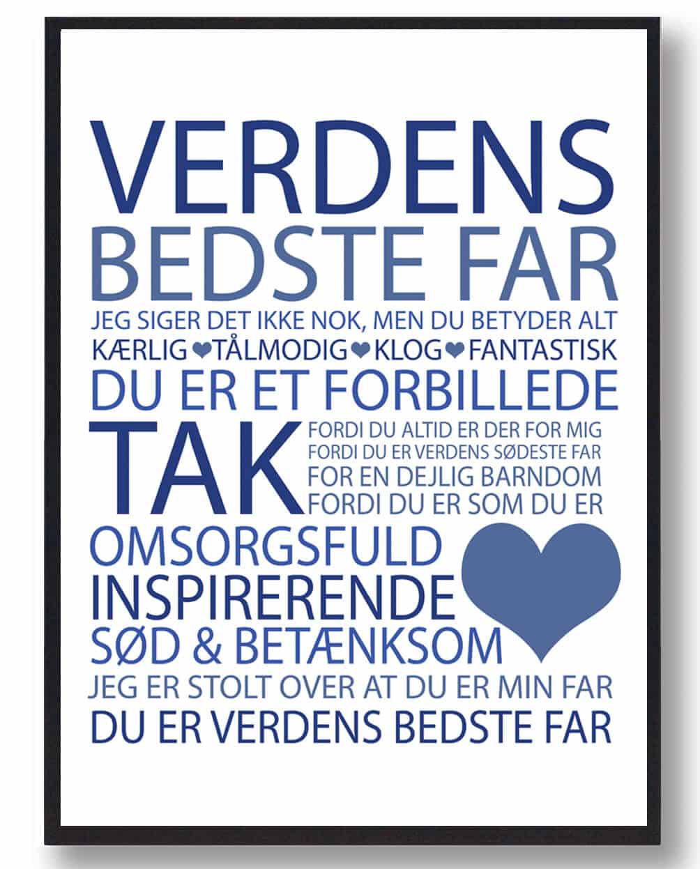 Verdens bedste far plakat blå Giv din far den hyldest, han fortjener med en stilfuld plakat, som siger Verdens bedste far og pynter flot på væggen. Design og indhold Plakaten har teksten Verdens bedste far i tydelig og elegant typografi på en blå bag